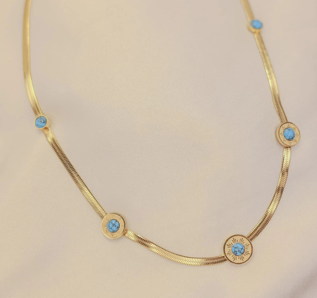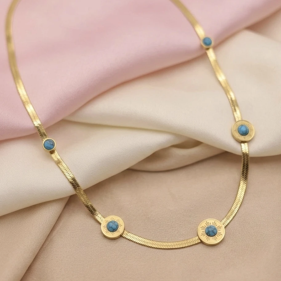MATERIAL:Base Metal: Stainless SteelPlating: Gold ToneType of Stone: Cubic ZirconiaStone Color:Turquoise DETAILS & DIMENSIONS:Closure Type: Lobster ClawNecklace Type: Chain NecklaceLength: 43 cmHeight: 21.5 cmWeight: 4.5 gm