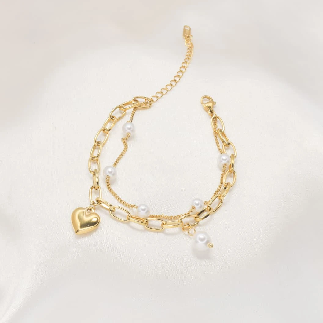 DETAILS:Base Metal: Stainless SteelPlating: 18k Gold ToneBracelet Type: Double Chain BraceletClosure Type: Lobster ClawType of Stone: PearlStone Color: WhiteDIMENSIONS:Length: 22 cmWeight: 5 gmNet Quantity: 1
