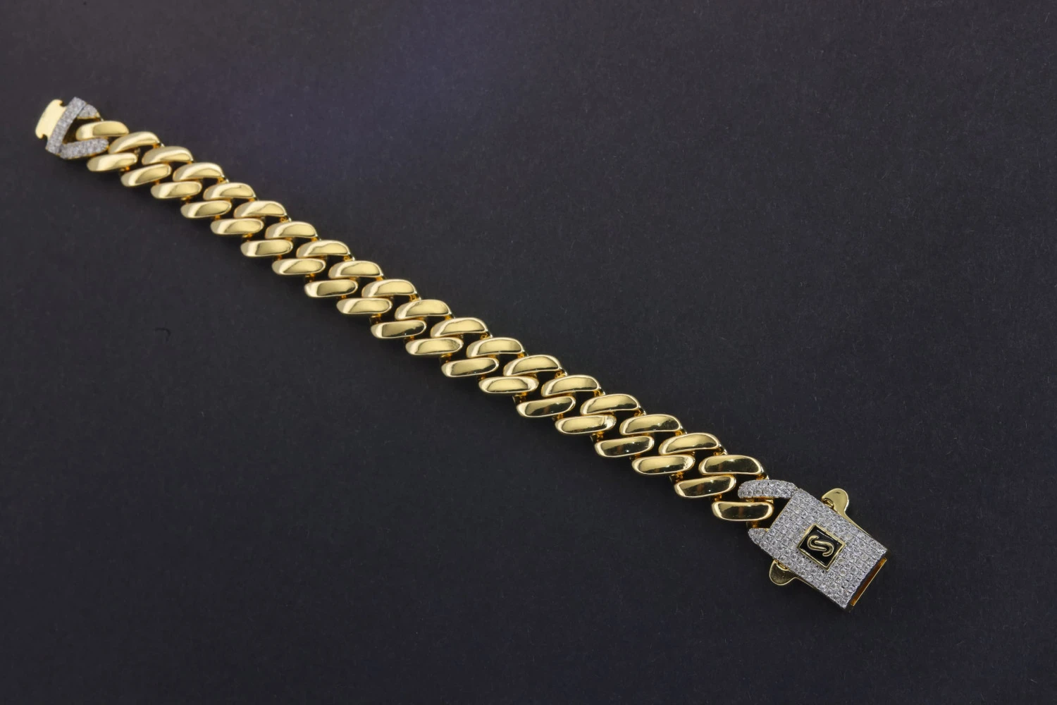 DETAILS:Base Metal: Stainless SteelPlating: 18k Gold ToneGender: MenBracelet Type: Chain BraceletClosure Type: Double Safety Box lockType of Stone: Cubic ZirconiaStone Color: WhiteDIMENSIONS:Length: 21.3 cmWeight: 21 gmNet Quantity: 1