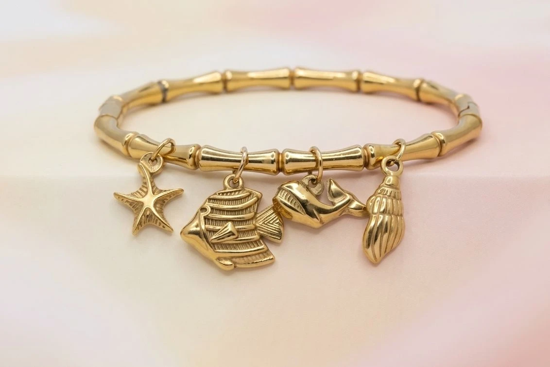 DETAILS:Base Metal: Stainless SteelPlating: 18k Gold ToneBracelet Type: Charm Bangle Bracelet Closure Type: Clip-OnDIMENSIONS:Length: 6 cmWeight: 22 gmNet Quantity: 1