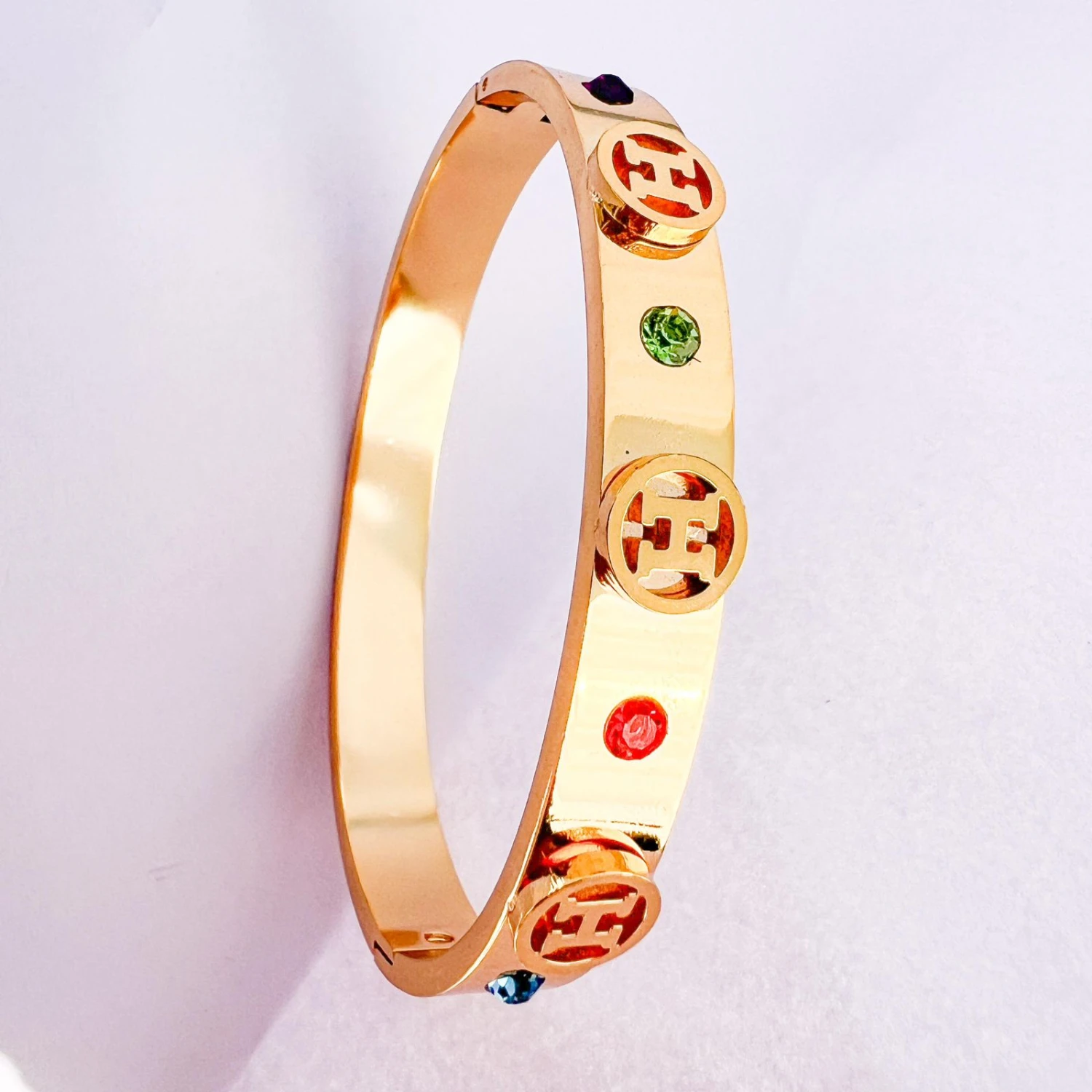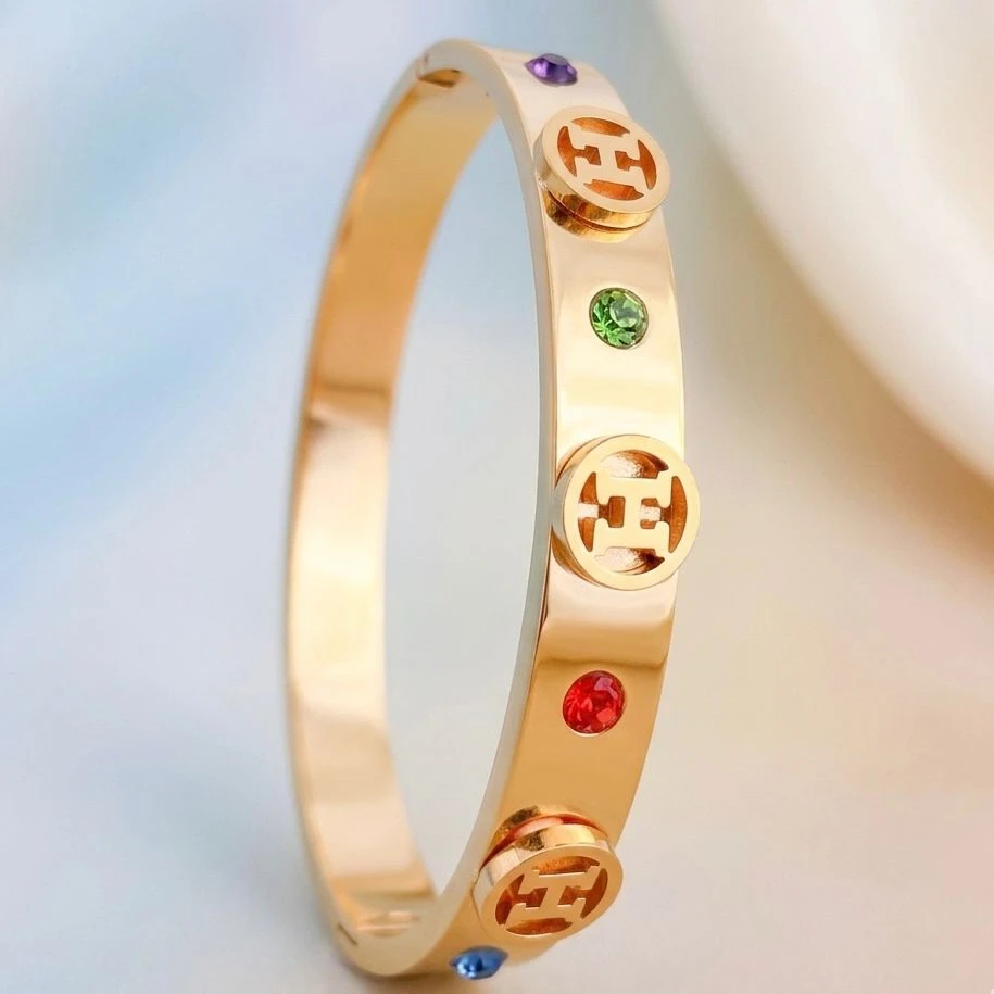 MATERIAL:Base Metal: Stainless SteelPlating: 18k Gold ToneType of Stone: Cubic ZirconiaStone Color: Multi color DETAILS & DIMENSIONS:Bracelet Type: Bangle BraceletClosure: Magnetic ClaspLength: 5.8 cmWeight: 10 gmNet Quantity: 1