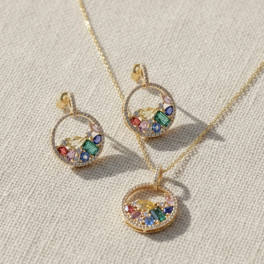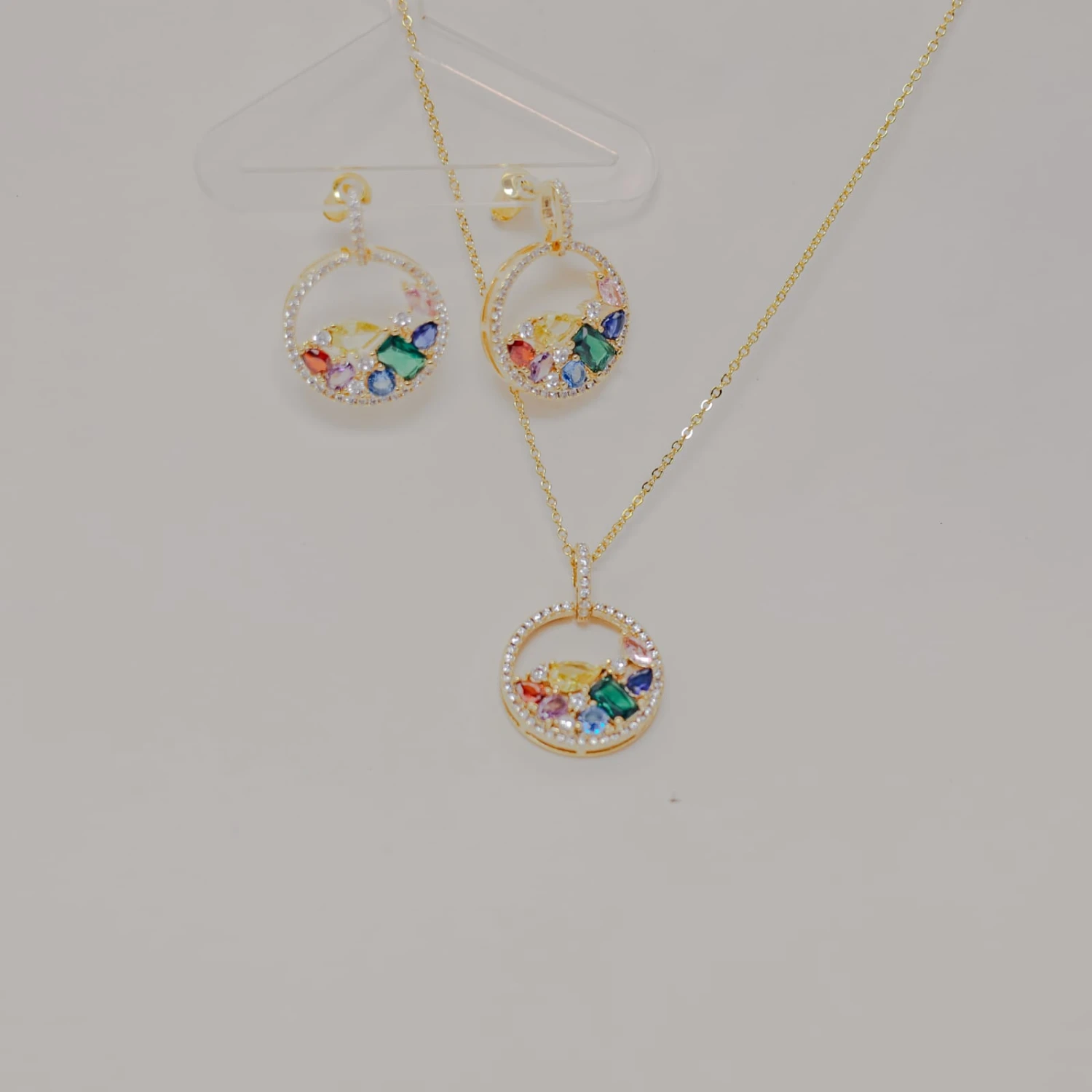 MATERIAL:Base Metal: Stainless SteelPlating: 18k Gold ToneType of Stone: Cubic ZirconiaStone Color: MulticolorDETAILS & DIMENSIONS:Necklace Type: Pendant Necklace & EarringsClosure: Lobster ClawLength: 47 cmWeight: 10.8 gmNet Quantity: 1