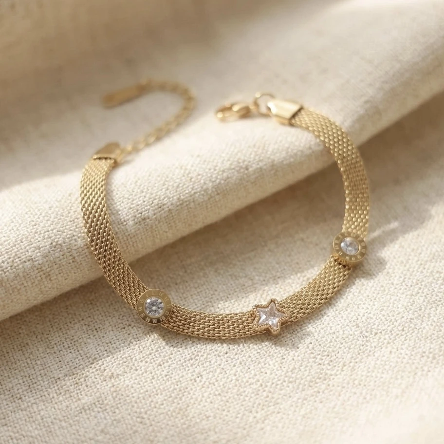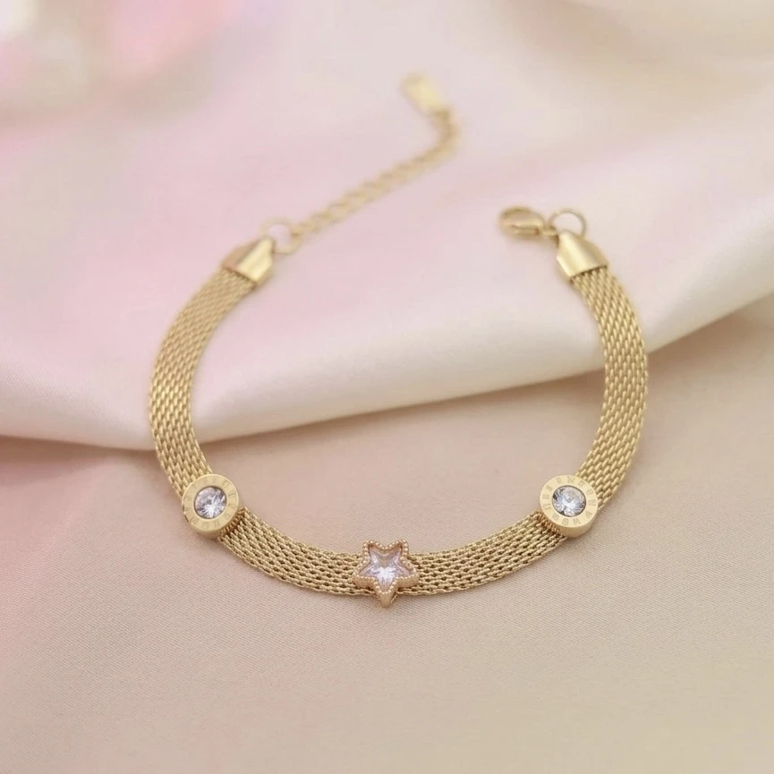 Base Metal : Stainless SteelPlating : Gold ToneBracelet Size : OnesizeWeight : 1.9 gmsBracelet Type : RegularNo of Stones: 3Key Features : Water Proof, Anti Tarnish, Skin Friendly, Light Weight