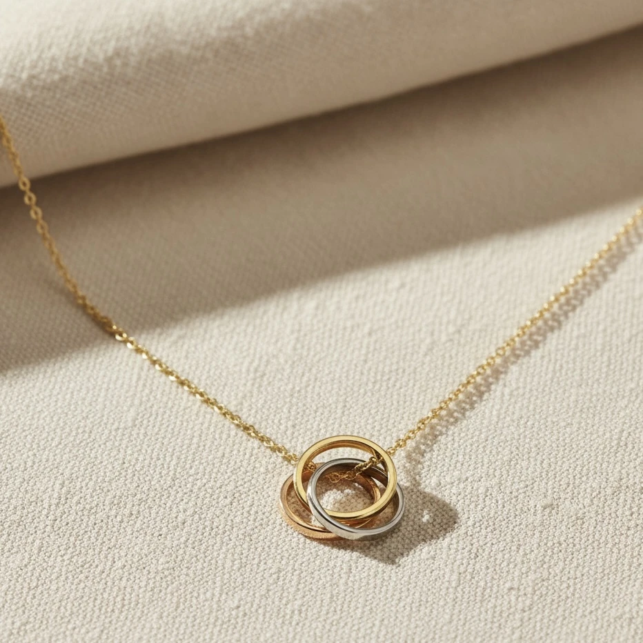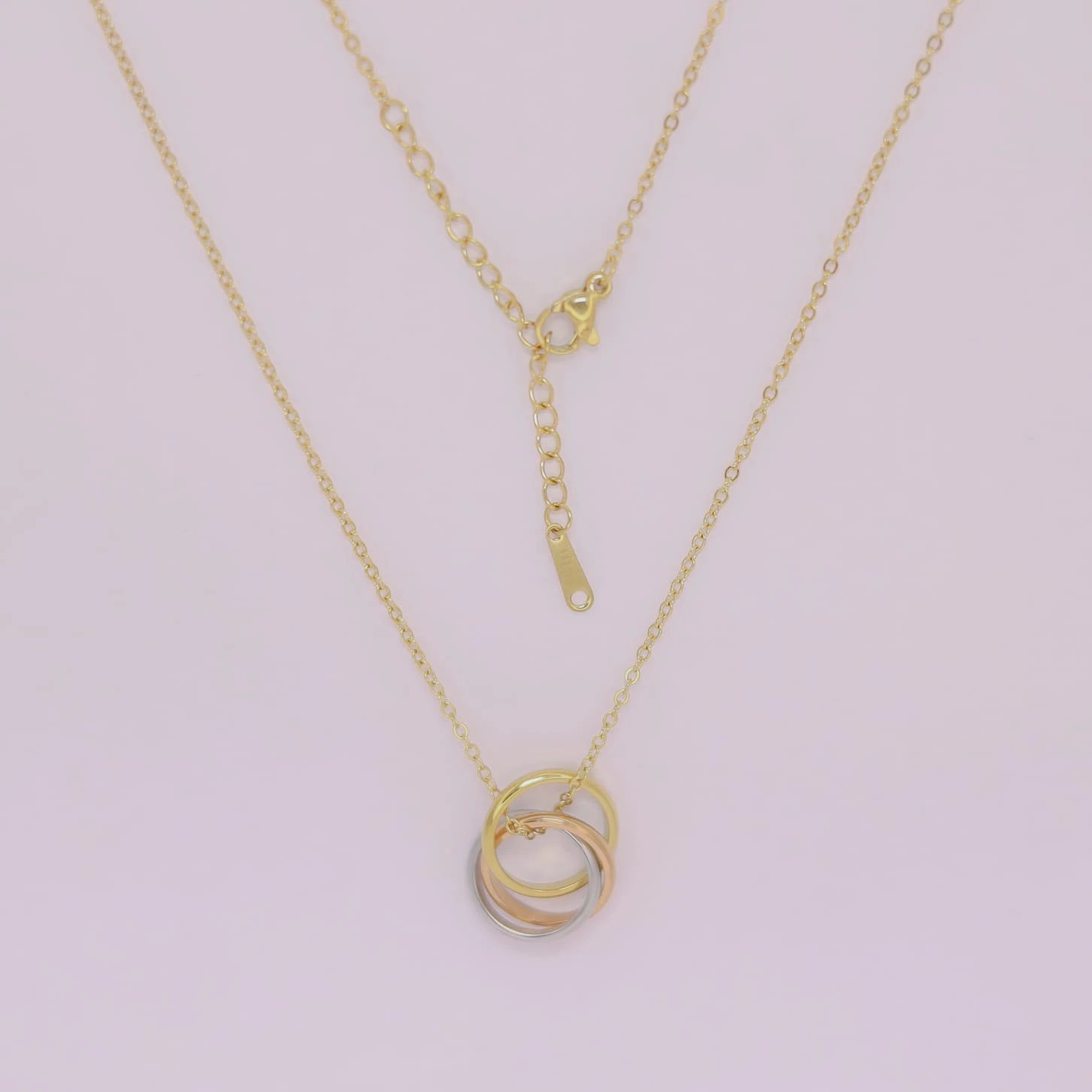 This beautiful necklace has three round circles in silver, rose gold, and gold.