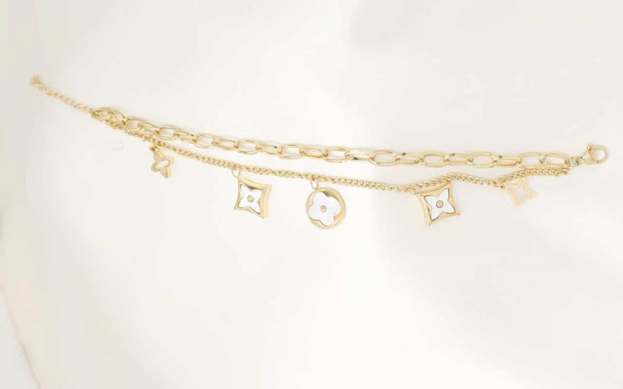 DETAILS:Base Metal: Stainless SteelPlating: 18k Gold ToneBracelet Type: Layered Bracelet WhiteClosure Type: Lobster ClawDIMENSIONS:Length: 15 cmWeight: 6.92 gm