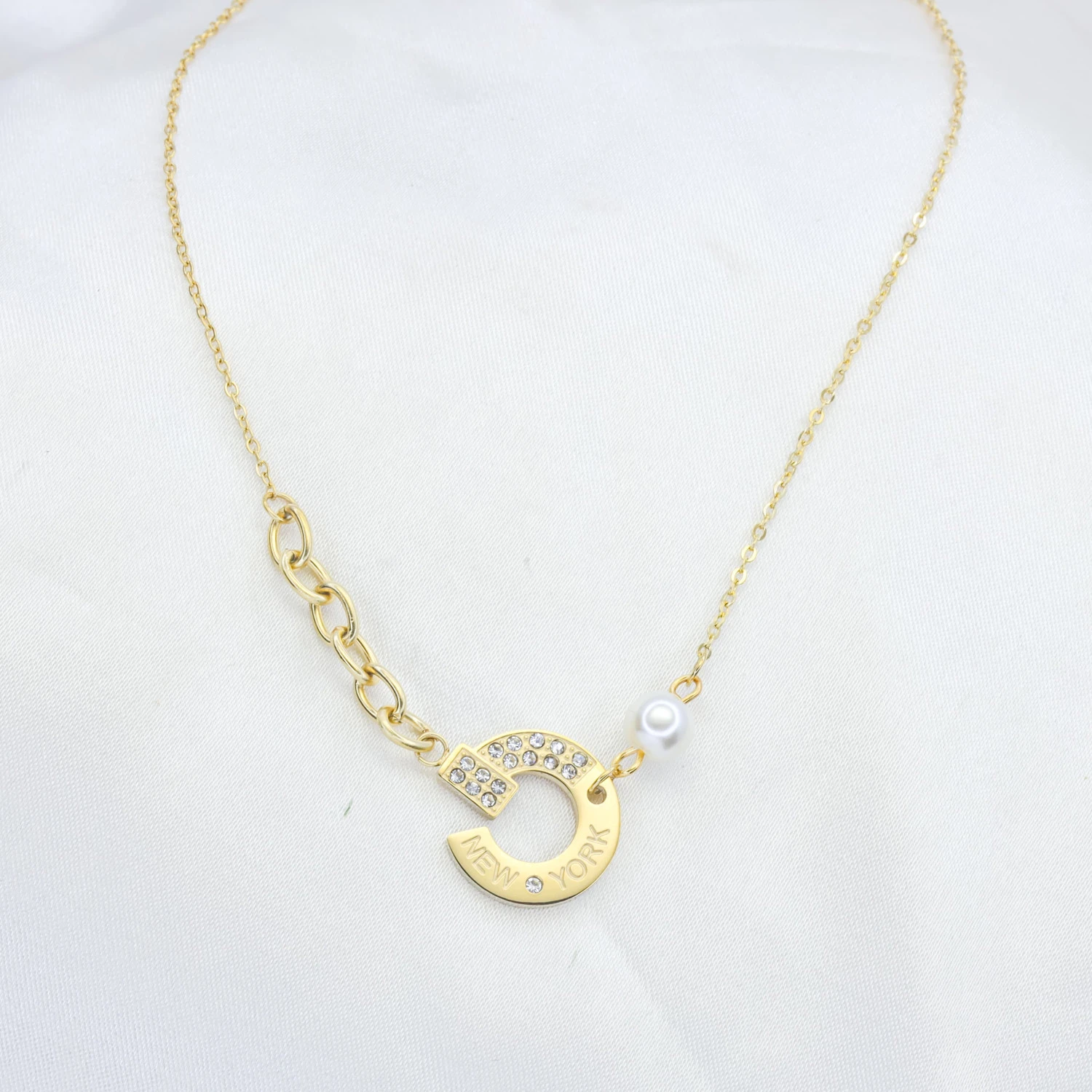 MATERIAL:Base Metal: Stainless SteelPlating: 18k Gold ToneType of Stone: PearlStone Color: WhiteNo of Stones: 1DETAILS & DIMENSIONS:Necklace Type: Short NecklaceClosure: Lobster ClawLength: 49 cmWeight: 2.89 gmNet Quantity: 1