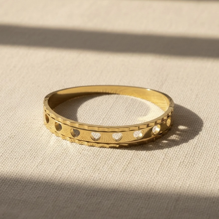 MATERIAL:Base Metal: Stainless SteelPlating: 18k Gold ToneDETAILS & DIMENSIONS:Bracelet Type: Bangle BraceletClosure: Clip-OnLength: 6.5 cmWeight: 28 gmNet Quantity: 1